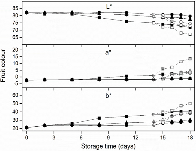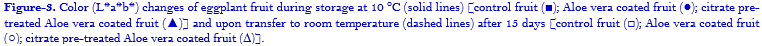 Lightness (L*) values decreased gradually while red/green (a*) and yellow/blue (b*) values increased for all fruit during storage (Figure 3). Uncoated fruit showed a significant reduction in L* but higher a* and b* values compared to the coated fruit, meaning that coating was important for retaining eggplant fruit lightness and delaying changes in color intensity during low storage temperature. Aloe vera coating is reported to cause a delay in ripening-induced color changes by slowing down fruit respiration (Chrysargyris et al., 2016). Similarly, reports showing delayed colour changes in peach (Hazrati et al., 2017) and suppression of green color loss in ‘Granny Smith’ apples (Ergun & Satici, 2012) emphasize the broad application range of Aloe vera gels as a fruit coating. Considering that color is one of the most important attributes of eggplants, the ability of Aloe vera gel to delay color changes can prove very useful in preserving the quality of the fruit after harvest.Transfer of fruit to ambient storage temperature after 14 d resulted in a more rapid change of color compared to those stored at low temperature. The change in color can be ascribed to increase in the metabolic rates caused by the higher storage temperature, and can contribute to fruit ripening and senescence.