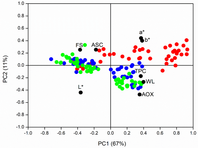 Figure-4. PCA bi-plot (PC1 is plotted against PC2) showing eggplant fruit at the different coating conditions. The samples scores (control fruit- red; beeswax-coated fruit- green; citrate-treated-beeswax-coated fruit- blue) is superimposed on the loadings (AOX- total antioxidant capacity; ASC- ascorbate; FS- firmness; TPC- total phenolic content; WL- weight loss; L* value; a* value; b* value).