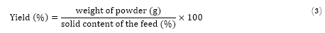 Prior to analysis, reconstitution of spray dried powder was performed by dispersing in distilled water at a ratio of 1:10 w/v (Chau, Wang, & Wen, 2007), while the fresh juice and whey were used as-is. Sensory evaluation was done by 9-point Hedonic scale in same manner as described earlier. Viscosity was measured at 25°C using Fungilab viscometer (VISCO BASIC Plus L, Spain), attached with L2 spindle at 100 rpm and expressed in centiPoise (cP). The pH was recorded by a digital pH meter (Eutech Instruments, Singapore). Titratable acidity and moisture content (MC) were determined by AOAC standard methods (AOAC, 2000). Total soluble solid (TSS) was measured by a digital refractometer (MA871 model, ATACO, Tokyo). Yield of powder was calculated usingEquation 3(Sulieman, 2014).