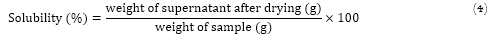 Solubility was determined according to the method described by Chau et al. (2007), and Equation 4 was used to calculate the percent solubility. Sample was reconstituted as mentioned earlier, stirred for 1 h at room temperature (25ºC) and centrifuged at 1500 rpm for 10 min. The supernatant was dried and weighed.
