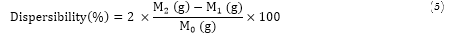 Dispersibility was determined by the method proposed by Aliakbarian, Casazza, Nani, and Perego (2017). Equation 5 was employed to calculate the percent dispersibility. Sample was reconstituted in water at a ratio of 1:10 (w/v), and stirred manually for 1 min at room temperature. The suspension was then allowed to stand undisturbed for 30 min, followed by weighing 50 ml of the aliquot.