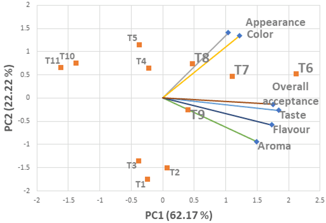 The samples were coded randomly in uniform containers and were presented to 20 semi-trained panelists to rate their sensory parameters, namely, appearance, colour, aroma, taste, flavour and overall acceptance (Pal, Khan, & Mohanty, 2008). Sensory scores of the blends were evaluated by PCA in XLSTAT software (version 22.5.1052.0, Addinsoft, New York, USA). A biplot was constructed to help discriminate the samples based on their spatial distribution across few Principal Components (PCs) (Das Purkayastha et al., 2012). Antioxidant activity was determined using 2,2-diphenyl-1-picrylhydrazyl (DPPH) radical scavenging assay, as described by Vani, Rajani, Sarkar, and Shishoo (2008).