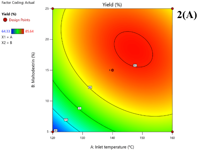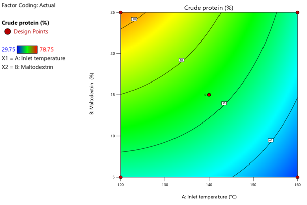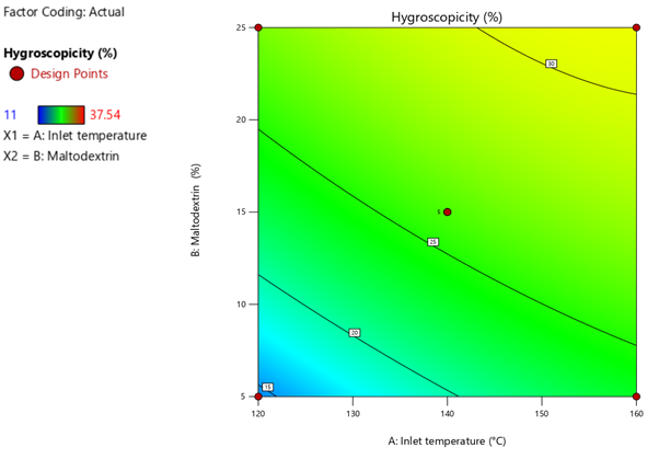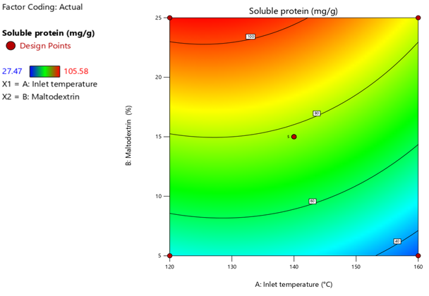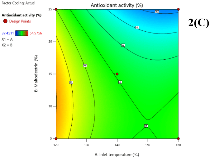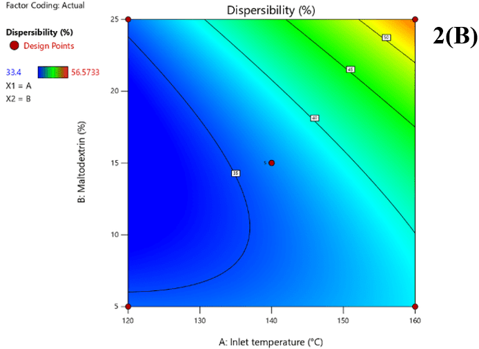 RSM was adopted to optimize the process conditions for obtaining reconstitutable beverage powderfrom Dillenia indica juice-whey blend, using a lab-scale spray dryer (LSD-48 Mini Spray Dryer, India), wherein the aspiration (air flow) and feed flow rate were kept constant at 45% and 20%, respectively. Prior to the operation, total solid of feed was set at 20%, and pH was adjusted within 3.8-4.5 (Park, Bastian, Farkas, & Drake, 2014). Inlet air temperature of the dryer (A) and MD concentration as drying adjunct (B) were taken as independent variables for the optimization of four response/dependent variables (powder yield (%), dispersibility (%), antioxidant activity (%) and organoleptic acceptability). The Central Composite Design (CCD) was applied using Design-Expert® software (Version 11.0.1.0, Stat-Ease Inc., Minneapolis, USA), which generated 13 experimental runs at α=±1.414 with 5 center points and 3 levels of each variables set as 120, 140 and 160°C of inlet air temperature, and 5%, 15% and 25% of MD Table 2. Analysis of variance (ANOVA) was performed on the experimental data and a difference of p≤0.05 between the experimental and predicted data was considered statistically significant. Experimental data for the selected responses were fitted into second order polynomial Equation 1 and were optimized by Desirability function Equation 2. High values of coefficient of determination (R2>0.90) indicate good fit between the observed and predicted values. Non-significant (p>0.05) lack of fit implies that the model is good and fit for prediction.