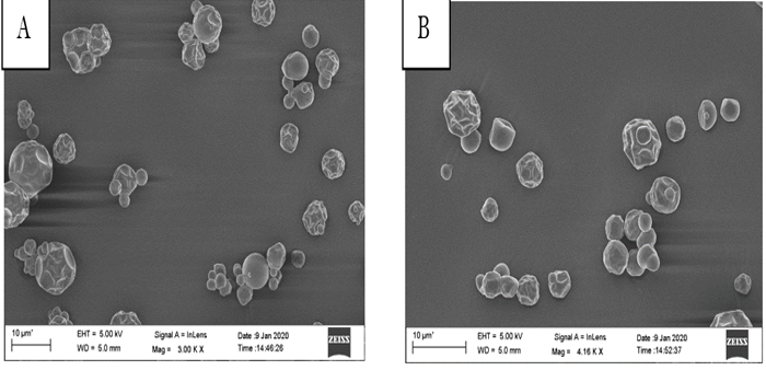 Bulk density and tap density were determined according to the methodology of Dantas, Pasquali, Cavalcanti-Mata, Duarte, and Lisboa (2018) and Equation 6 & 7 were used for its calculation. Powder was poured into a graduated measuring cylinder and the volume occupied was recorded. Similarly, for tap density, the same sample in the measuring cylinder was tapped until no difference was noticed in the scale of the cylinder.