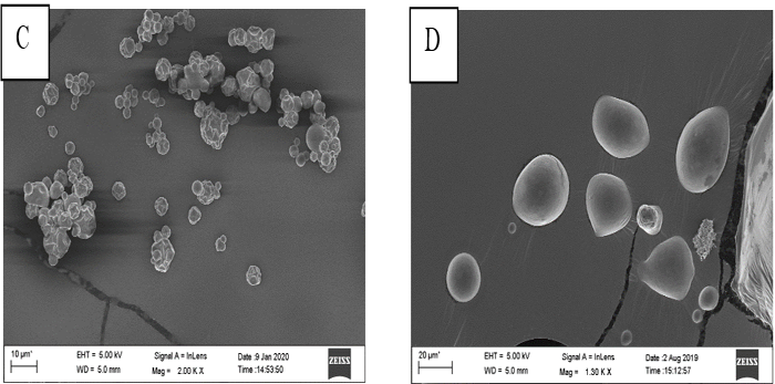 Figure 3. SEM images of beverage powder obtained at (A) 168°C and 15% MD (B) 140°C and 15% MD, (C) 140°C and 29% MD, (D) 111.7°C and 15% MD, (E) 120°C and 25% MD, (F) 140°C and 0.89%MD, (G) 160 °C and 19.7% MD.