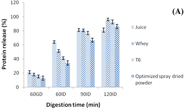 Digesta obtained from simulated gastric and intestinal digestion phases of T6 blend and its powder were compared with those of fresh D. indica juice and concentrated whey. It is apparent from Figure 4(A) that the percent protein released from the optimized powder, T6 blend and concentrated whey were lesser than that of fresh juice, possibly due to the presence of β-lactoglobulin in them, which is reported to be resistant to gastric digestion (Fu, Abbott, & Hatzos, 2002; Meena, Prasad, Khamrui, Mandal, & Bhat, 2021). As anticipated, the liberated protein from all the samples was seen to increase with time towards the intestinal digestion. However, the percent release from the optimized powder and T6 in both the phases of digestion was lower when compared to concentrated whey. This observation could be backed by the probable complexation/interaction of proteins with polyphenols, leading to lower leaching (Francielli et al., 2020).