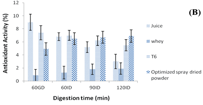 Furthermore, the antioxidant activity of the digesta obtained at different phases of gastrointestinal digestion is shown in Figure 4(B). The overall DPPH scavenging activity of the optimised powder, fresh juice, T6 blend, and whey, was lower after digestion than that prior to digestion (p<0.05). It reduced by 85% in the optimized powder and that of whey, T6 blend and fresh juice reduced by 72%, 90% and 95% respectively. Similar observation of drastic reduction in antioxidant activities after digestion is reported by numerous authors (Desseva & Mihaylova, 2020; Mihaylova et al., 2021).