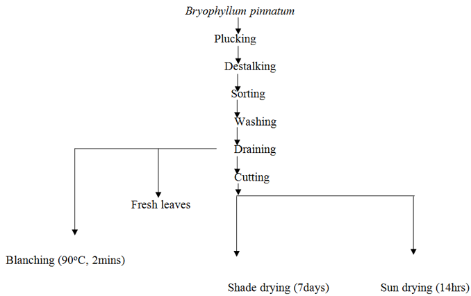 The fresh leaves of Bryophyllum pinnatum were collected from a private farm at Nru in Nsukka Local Government Area, Enugu State, Nigeria and were identified in the department of Plant Science and Biotechnology, University of Nigeria, Nsukka. The Bryophyllum pinnatum leaves were destalked, sorted to remove immature, insects and mould infested substandard materials. The B. pinnatum leaves were washed and rinsed to remove dirt and other foreign materials left after sorting and allowed to drain naturally. The drained leaves were divided into four (4) treatment groups. The first group was shade dried, the second group was dried under the sun; the third group was blanched; while the drained sample that was neither dried nor blanched served as control. Samples from four (4) treatments were analyzed for their chemical composition.