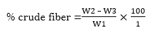 The crude fiber content of the sample was determined using the method of AOAC (2010). Two grams of each sample was weighed (W1). The weighed sample was boiled for 30 minutes with 200 ml of 0.21 M H2SO4then filter through a funnel. The residue was washed with boiling water until the sample is no longer acidic. The washed residue was boiled for another 30 minutes with 200 ml of 0.02 M sodium hydroxide solution, filtered and washed three times with hot water and methylated spirit. The residue was allowed to dry at 100 oC to a constant weight (W1). It was transferred into a dry crucible and weighed (W2). The weighed residue was ashed at 500 oC for 3 hour, cooled and reweighed (W3). The percentage crude fiber was calculated using the expression;