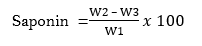 Saponin was determined using the method described by AOAC (2010). Five gram (5 g) of each sample was weighed and dispersed in 100 ml of 20% ethanol. The suspension was heated at 55˚C in hot water bath for 4 hours with continuous stirring. The residue after filtration was re – extracted with another 100 ml of 20% ethanol. The combined extract was reduced to 40 ml in a water bath at 90oC. The concentrate was transferred into a 250 ml separating funnel and 20 ml of diethyl ether was added, shook vigorously. The aqueous layer was recovered while the ether layer was discarded. The purification process was repeated and about 30 ml of n- butanol was added. The combined n-butanol extracts was washed twice with 10 ml of 5% aqueous sodium chloride. The remaining solution was heated in a water bath. After evaporation the samples was dried in the oven to a constant weight.