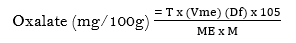 The determination of oxalate was carried out by the titration method of AOAC (2010). Two gram (2 g) of sample was suspended in a mixture of 190 ml of distilled water and 10 ml of HCl in a 250 ml volumetric flask and digested for one hour at 100oC; it was cooled and made up to 100 ml with distilled water. The digest was filtered through whatman filter paper No. 1 using a suction pump.