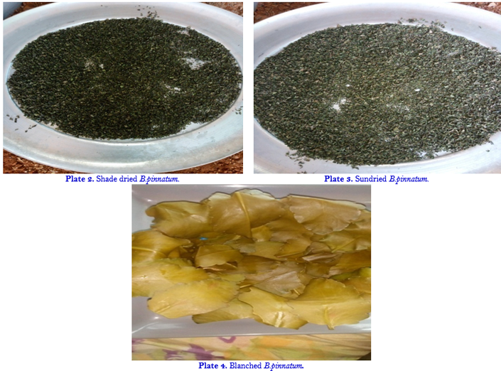 From the results of this research, it was evident that sun and shade drying caused a significant (p<0.05) increase in proximate, vitamin and mineral composition of B. pinnatum. The shade dried leaves having high nutritional composition can be used to supplement food during food preparation. Blanching caused reduction in anti-nutritional composition though there was significant (p<0.05) loss in minerals and vitamins content.