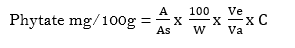 Phytate content was determined according to the method described by Pearson (1976). A 0.5 g of the sample was weighed into a 500 ml flat bottom flask. The flask with the sample was shook in a shaker and extract with 100 ml 2.4% HCl for one hour at 25oC. It was decanted and filtered. Five milliliter (5 ml) of the filtrate was diluted to 25 ml with distilled water. Fifteen milliliter (15 ml) of 0.1M sodium chloride was added to 10 ml of diluted sample and pass through whatman No. 1 filter paper to elute inorganic phosphorus, and 15 ml of 0.7M sodium chloride was also added to elute phytate. The absorbance was red at 520 nm and was calculated as follow: