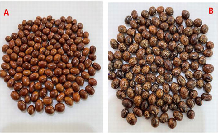 Figure 1. Dried AYB seeds. (A) Non variegated seeds (B) Variegated seeds.
