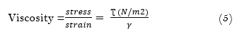 The viscosity was determined under lamina flow at a torque of 10-100% using a brook field viscometer. The spindle of the viscometer was immersed in the fluidized sample in a 600ml beaker and the spindle rotated at the center of the fluid. The viscometer readings were obtained at different temperatures. Also, the viscosity was also obtained using the equation stated below;