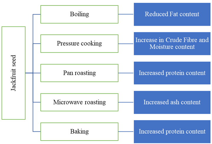 Various methods are involved in the pre-processing of Jackfruit seeds in order to make it suitable for further incorporation into various food products. The seeds after undergoing the processing treatments undergo various changes in their physico-chemical properties. The processed seeds are then milled to flour and are used for further applications. The seeds are mainly pre-processed by techniques such as baking, pan roasting, pressure cooking and microwave roasting. After being subjected to various pre-treatments they exhibit various changes in their physico-chemical properties which are shown in a schematic diagram down below.