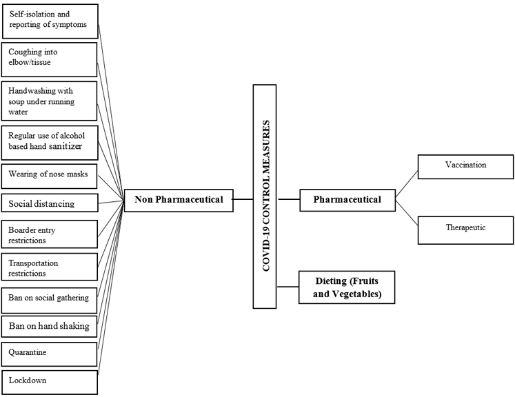 Unlike the 1918–19 H1N1 influenza pandemic, where there were no medications or vaccines to cure or prevent the disease, a variety of non-pharmaceutical interventions such as travel bans and limitations, school and workplace closures, isolation of ill persons, quarantine of exposed people, social distancing, and cancellation of major gathering events were implemented in the early stages of the epidemic and were proven to be effective (Ayouni et al., 2021). With the advancement in knowledge and technology, the current epidemic has seen the implementation of various strategies both pharmaceutical and non-pharmaceutical to minimize SARS-CoV-2 transmission. World Health Organization (WHO) published guidelines in 2019 for non-pharmaceutical public health strategies to reduce the risk and effects of the epidemic and pandemic influenza (Burns et al., 2020). Many countries have implemented preventative methods to prevent or reduce COVID-19 infection (Al-Tawfiq & Memish, 2020; Hasnain, Pasha, & Ghani, 2020). Ghana introduced public health interventions such as public education and physical separation to prevent coronavirus illness transmission (COVID-19).  Again, instead of a total lockdown, Ghana maintained various parts of the country and critical services open in lockdown regions and advised people to wear face masks on a regular basis. Lockdowns have been reported (Basu et al., 2020; Salvatore et al., 2020) to have a strong correlation with a reduction in the spread and the number of reported cases of the virus. Nonetheless, some authors have reported on its partial effectiveness due to state-level variations and have suggested its implementation with other interventions such as social distancing and community-wide face mask-wearing to make it more effective (Meo et al., 2020; Thu, Ngoc, & Hai, 2020). Some scholars (Bo et al., 2021; Hossain et al., 2020; Lai et al., 2020; Nunan & Brassey, 2020; Suh, Meehan, Blaisdell, & Browne, 2021) have reported on these interventions and have ascertained their effectiveness in response to the outbreak when implemented earlier in the epidemic. Other measure put in place included social distancing, in-land transportation restrictions, ban on travels by sea and air, quarantine of infested individuals, ban on social gathering, compulsory washing of hands and wearing of face masks at public places Figure 1.