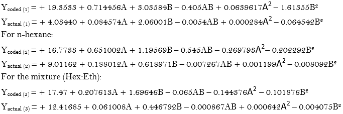 Model reduction is the elimination of the not significant terms from the model, such as the term for a predictor variable or the interaction between predictor variables. Model reduction helps to increase the precision of the predictions by enhancing the fit between data and model. The regression model of the soybean oil extraction using n-hexane was not reduced because all terms of the model were significant. The reduced regression models of the soybean oil extraction in terms of coded and actual factors are presented in equations as follows: