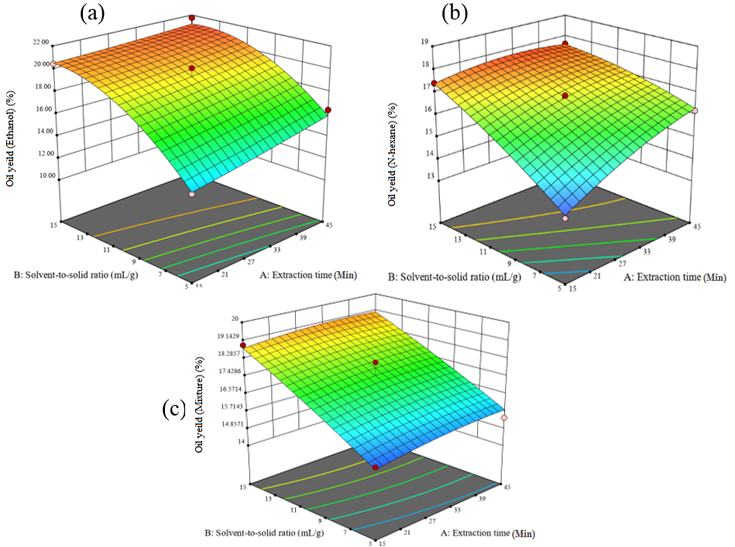 Figure 1. 3D response surface plots showing the effect of solid-to-solvent ratio and extraction time on the oil yield using different types of solvents: (a). Ethanol, (b). N-hexane, and (c). Mixture of Hex:Eth