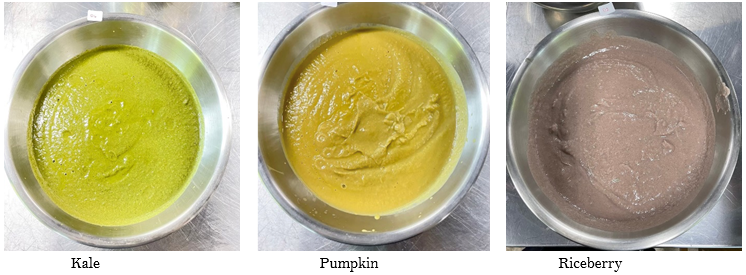 Pureed banana inflorescences may be used to create various recipes. In this study, various soups from banana inflorescence purees were prepared using the puree (XG-3) as the base ingredient. The soups included kale leaf, pumpkin, and Riceberry flavored soups. The standard recipe consisted of 95 g of banana inflorescence puree (XG-3), 100 g of chicken stock, and 20 g of flavored ingredients (kale leaf powder, pumpkin powder, or Riceberry flour). All the ingredients were thoroughly combined, poured into a stainless-steel pot, and then heated for 20 minutes on an electric hot plate until boiling. The soups were allowed to cool to room temperature before they were tested.
