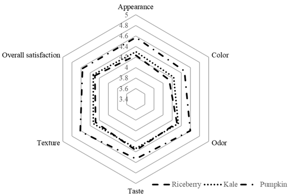Figure 5. Radar chart representing mean scores, 5-point hedonic scale, of the sensory evaluation for the soups (Kale, Pumpkin, and Riceberry flavored soups).