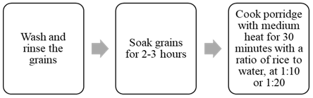 There are several methods (Table 2) used in cooking porridge, which vary according to region and culture. However, simmering is widely regarded as the predominant method for the preparation of congee or porridge and is sometimes classified as a traditional culinary technique. In the typical preparation of porridge, it is customary to rinse rice or other grains in order to eliminate any potential pollutants before commencing the cooking process. In the customary practice observed in Korea, it is common to immerse rice in chilled water for a duration of 1-2 hours prior to its transformation into porridge. Then, the wet rice is added to a stainless-steel pot and cooked at a medium-high temperature while being stirred occasionally with a wooden spoon (Shim & Lim, 2013). In comparison, Tang, Cai, and Xu (2016) mentioned that the soaking period for ordinary home-cooking of rice porridge in China is 2.5 hours. Normally, pre-cooking methods involve rinsing to remove contaminants and soaking prior to cooking to shorten the cooking period. It is claimed that these pre-cooking methods are different between countries (Yamuangmorn, Dell, & Prom-U-Thai, 2018). Based on the statement by Chen et al. (2021), Chinese folks normally prepare porridge by adding water or broth around 20 times the weight of the rice and simmering it at room temperature. A similar cooking method is used in Malaysia, where the rice is mixed with 10 times as much water and the porridge is usually cooked in a pot on low heat for at least 30 minutes (Karen et al., 2021). Meanwhile, in Japan, “okayu” isa Japanese rice congee that is prepared by using a ratio of rice to water of about 1:5, which is considered much thicker than the rice porridge made in other countries (Keawkaika, Suzuki, & Hagura, 2010).