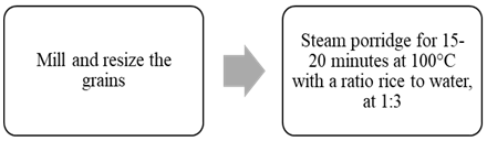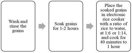 Nowadays, the majority of Asian households own an electronic rice cooker to make life easier by reducing the amount of time spent stirring rice congee in a pot on the stove. Nguyen et al. (2014) prepared rice congee using an electronic rice cooker. Rice is washed with tap water once before soaking in water, with a ratio of rice to water of 1:1.5 for 1 hour. The soaked rice was cooked in an electronic rice cooker using an embedded program for porridge at 100°C for 1 hour and 20 minutes with a ratio of rice to water of 1:6. A similar process for cooking millet porridge was done by Zhang et al. (2022). The first step is washing the millet grains twice with purified water. Then, the washed millet was placed in an electronic cooker filled with purified water using a millet-to-water ratio of 1:14. The mixture was left boiling in an electronic cooker for 40 minutes in order to obtain the millet porridge. Besides, Tang et al. (2016) also used an electronic rice cooker to prepare black rice porridge. The black rice was soaked in water with a ratio of rice to water of 1:5 for 2 hours and 30 minutes before it was cooked. Without draining the soaking water, the soaked rice was cooked in an electronic rice cooker for 20 minutes with a rice-to-water ratio of 1:6.