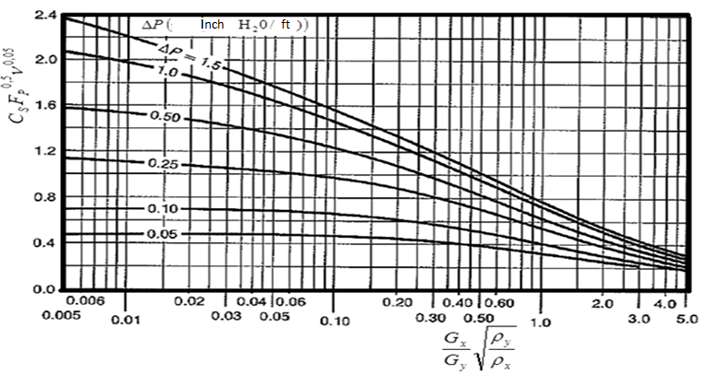 Figure 1 enables to obtain the pressure loss in packing in inches water/ft packing; µ0 is the gas superficial velocity in ft/s; is the liquid viscosity in centistokes; Gx and Gy correspond to liquid and gas flows, respectively, and are measured in kg/m2.s; ρy and ρx is the density in kg/m3, and Cs is quantified by Equation 1, FP is a pressure loss factor which depends on the geometry and characteristics of the filling (Mccabe et al., 2005).