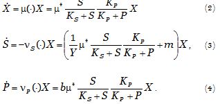 In the dynamical model (2)-(4), X is the biomass concentration, S represents the substrate (nutrient) concentration, and P is the product concentration (lactic acid). is the specific growth rate,