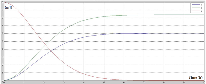 The simulation results are presented in Fig. 1, where the time profiles of the biomass, substrate and product concentrations are depicted. As can be seen, a typical symmetrical behaviour is obtained: the substrate is consumed as the biomass is growing and the lactic acid is produced. Usually, due to the batch operation, the process ends after a period of time (e.g. 7 hours).
