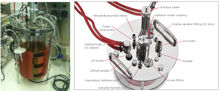 The cell culture package includes: Integrated 4 gas mixing system (Air, O2, N2, CO2); Freely selectable gas outlets to sparger or overlay; 4 Flow meters for individual gas flow rate adjustment; DO (dissolved oxygen) control via stirrer speed, gas mix and substrate addition; pH control via CO2 / Acid and Base. The microbial culture package is provided with: Airflow gassing system with oxygen enrichment capability (Air, O2); Efficient agitation system for high cell density fermentation; DO control via stirrer speed, gas mix and substrate addition.