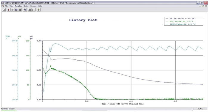 The results obtained with the Biostat experimental setup are presented in Fig. 6. (pH, temperature and pO2 time evolution). In the case of New Brunswick experiments, the time profiles of the pH and temperature are given in Fig. 7. As can be observed, the real fermentation process is over when the pH is stabilized and the microorganism growth is inhibited, after approximately 7 hours.