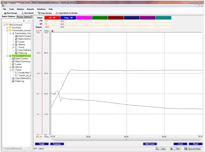 Each control loop has a separate monitoring screen. Also, a calibration screen (for the DO, pH and level sensors) and a setup screen can be used. Beside the built-in programme, the bioreactor can be remotely controlled by using the New Brunswick BioCommand software (Eppendorf, 2012). A NBC OPC Server is required in order to achieve the communication between the remote computer and the bioreactor control unit which contains all the controllers. A recipe created with BioCommand is presented in Fig. 5. This recipe allows the configuration of various control loops. The auxiliary equipment presented in section 3.1 is also used with the New Brunswick bioreactor to implement the lactic fermentation process.