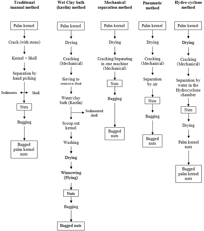 The methods used for the separation of cracked kernel mixtures includes; traditional hand picking method, clay water bath (kaolin) method, the use of mechanical separator, the pneumatic kernel separator and the hydrocyclone methods as presented in Figure 1.