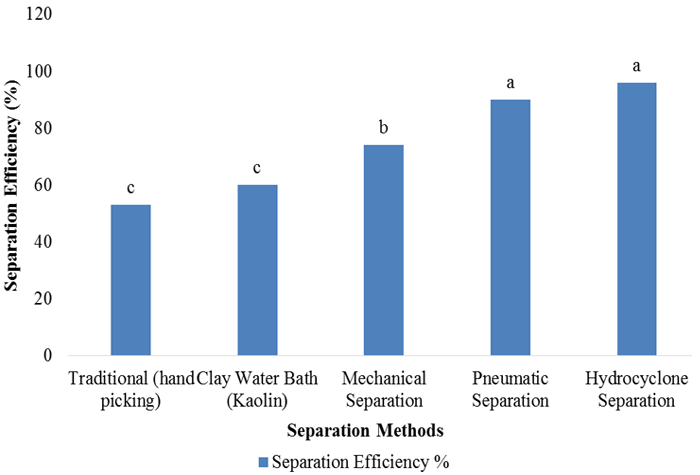 Ronald (2012) reported that the kaolin used in clay water bath separation method was expensive and produces a lot of waste after the separation process. He attributed the poor efficiency of the method to the fact that it is very hard to obtain the right ratio of water and kaolin for a perfect separation hence processors use trial and error methods which do not give an efficient separation. This could be the probable reason for the low efficient separation of 60% obtained in this study.