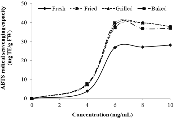 The inhibition percentage was expressed as milligram Trolox Equivalent per gram of the fresh sample (mg TE/g FW) and the IC50 was calculated as the concentration of extracts causing a 50 % inhibition of ABTS radical.