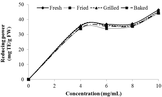 The reducing power of the extracts was evaluated according to the protocol of Oyaizu (1986). One milliliter of different concentrations of the samples were mixed with phosphate buffer (1 mL, 0.2 M, pH = 6.6) and potassium ferricyanide [K3Fe(CN)6] (1 mL 1 g/100 mL). The mixture was incubated at 50°C for 20 min. Trichloroacetic acid (TCA) (1 mL, 10 g/ 100 mL) was added to the solution and then centrifuged for 10 min at 3000g. The supernatant was gathered, mixed with distilled water (1.5 mL) and FeCl3 (150 µL, 0.1 g/100 mL), finally the absorbance was measured at 700 nm, increased absorbance of the reaction mixture indicate an increase in reducing power. Results are expressed as milligram Trolox Equivalent per gram of fresh weight (mg TE/g FW). The RC0.5 was calculated as the concentration of extracts reducing 50 % of ferric ions.
