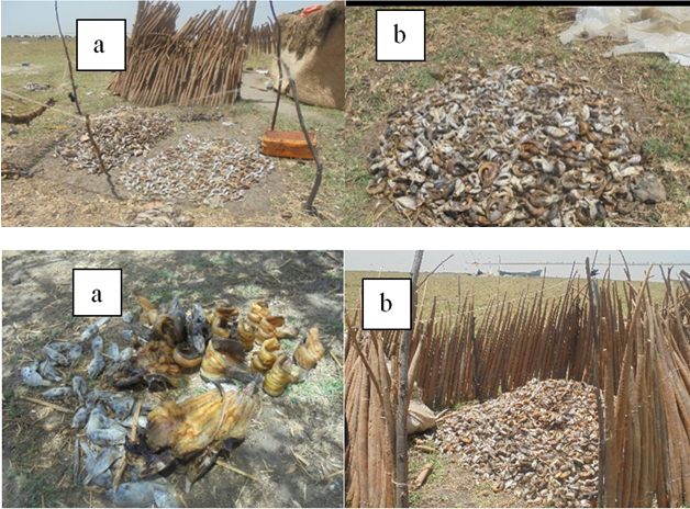 From the 150 collected samples, 50 of them are contaminated whith. The contamination rate is then about 30%. The percentage of contaminated samples is very high. Knowing that fungals growth in relative high humidity area, this importance of contamination reveal then an inappropriate process of dried and smoked fish or inappropriate storage conditions of fish. Dried and smoked fish are store around the lake where humidity is relatively higher. The following picture is an evidence of inappropriate storage conditions which is an important factor in fungal growth Figure 1.