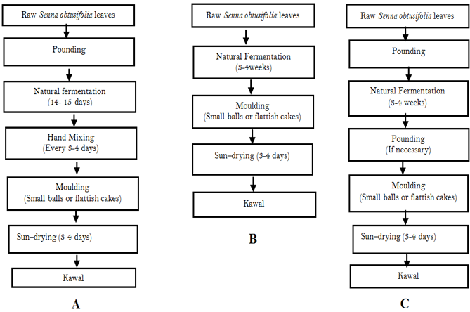 The production of kawal is a traditional process involving different unit operations with the most important being fermentations and drying after harvesting of the leaves. The technologies used in kawal production are often applied on a small scale and still mainly at the household level, characterized by the use of simple and rudimentary equipments under poor hygenic conditions. These technologies remain traditional with the empirical knowledge and the know-how is transmitted from mother to daughter and from generation to generation. Different varieties of technologies processes in kawal production depending on the sites and producers Figure 3 was observed in this study and the essentiel operation are the fermentation and drying. The flow general chart of the processing line of Senna obtusifolia fresh leaves to Kawal food condiment is presented in Figure 4.