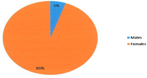 Figure 2 shows the gender distribution of the respondents. Five respondents (5.4%) were males while 88 (94.6%) were females. the study revealed that majority (94.6%) were females. This result is in line with the studies conducted by Mensah et al. (2002) (98.4%), Donkor et al. (2009) (98.9%), Ackah et al. (2011).