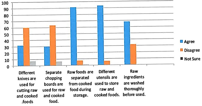 The results of the study revealed that the vendors practiced some form of food handling. Figure 3 shows the results and 56 (60%) of the vendors agreed that different knives should be used for uncooked and cooked foods while 30 (32.25%) of the respondents disagreed and 7(7.52%) were not sure. Again the statement that separate chopping boards should be used for uncooked and cooked foods, 59 respondents representing (63.44%) agreed to the statement while 28 respondents representing (30.11%) disagreed and 6 of them representing (6.45%) were not sure. Also, when the respondents were asked if uncooked and cooked foods should be separated in different utensils during storage, 85 respondents representing (9139%) agreed that separate utensils must be used while 7 of them representing (7.52%) disagreed and 1(1.1%) was not sure. Again majority of the respondents 63(67.7%) agreed to the statement that raw ingredients should be washed thoroughly before used while minority of them 30(37.25%) disagreed.