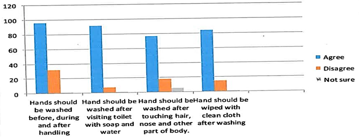 Figure 4 presents the results on the practices of hands washing. Out of the 93 respondents, 89 (95.6%) of them agreed that hands must be washed before, during and after handling food while 3(3.22%) disagreed and 1 (1.1%) was not sure. Also, 85 (91.39%) of them were of the view that hands should be washed after visiting toilet while 7(7.52%) of them disagreed and 1(1.07%) was not sure. On the washing of hands after touching hair, nose and other part of the body, 71 respondents representing (76.37%) agreed that hands should be washed after touching hair, nose and other parts while 17 of them representing (18.3%) disagreed and 5(5.37%) were not sure. Most of the respondents, 78(83.9%) agreed that hands must be wiped with clean cloth after washing while 14(15%) of them disagreed and was not sure.