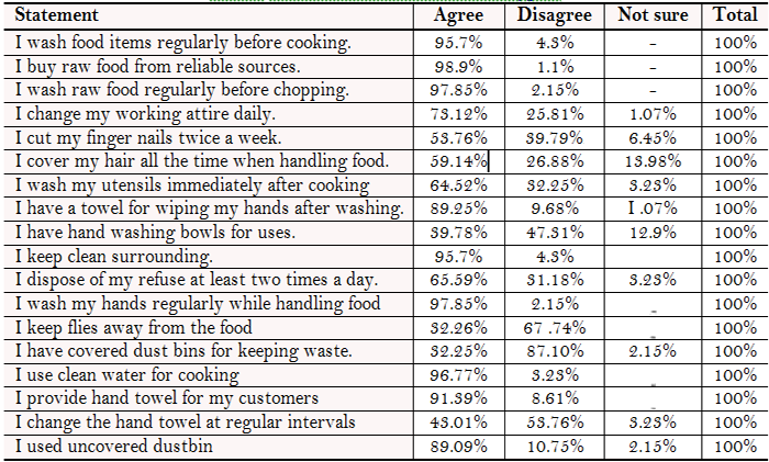 Table 3 shows the results obtained from the food vendors on their attitudes towards food hygiene. Out of the 93 respondents, 89 of them (95.6%) agreed that they wash their food items regularly before cooking while 4 respondents (4.4%) disagreed. Regarding where they buy their raw food from, majority of them (97.9%) agreed that they buy from reliable sources but (1.1%) disagreed to the statement. Concerning whether respondents wash their food items regularly before chopping, 91 respondents representing (97.85%) agreed to the statement and 2 respondents representing (2.15%) disagreed to the statement. On their attire, 68 of the respondents representing (73.2%) agreed that they change their attire daily while 24 of' them representing (25.8%) disagreed and 1respondent representing (1.1%). was not sure. Regarding cutting of finger nails, 50 of the respondents (53.8%) agreed that they cut their fingernails twice a week while 37 of them (39.8%) disagreed and 6 respondents (6.4%) were not sure. Concerning what respondents do to their hair, when handling food, 55 of the respondents representing (59. 1%) agreed that they cover their hair all the time when handling food but 25 of them (26.9%) disagreed while 13 respondents (14.0%) were not sure. Regarding washing of utensils after cooking, most of the respondents 60 (64.52%) agreed that they wash their utensils immediately after cooking while 33 respondents (32.25%) disagreed whereas (1.07) of the respondent was not sure. However, on hand washing bowls, 37 of the respondents representing (39.78%) agreed that they have hand washing bowls for hand washing while 44 of them (47.31%) disagreed and 12 respondents (12.9%) were not sure. The table again shows that out of the 93 respondents, 89 of them representing 95.70% agreed that they keep their surroundings clean while 4 of them (4.3%) disagreed. Regarding disposing off refuse twice a day, 61 of the respondents representing (65.59%) agreed that they dispose of their refuse at least twice a day while 29 of the respondents (31.18%) disagreed to the statement and 3 of them (3.23%) were not sure. Regarding washing of hands before food handling, majority of the respondents 91(97.85%) agreed that they wash their hands regularly while handling food while 2 of them (2.15%) disagreed. Concerning keeping flies away from food, 30 of respondents representing (32.26%) agreed while 63 of them (67.74%) disagreed to the statement. When asked if respondents provide hand towels for consumer to clean their hands, 85 of the respondents representing (91.39%) agreed that they provide hand towels while 8 (8.61%) of them disagreed to the statement. regarding how often the hand towels are changed, only 40 of them (43%) agreed that they changed the hand towels at regular intervals. Fifty (50) of them (58.9%) disagreed and 3 of them representing (3.23%) were not sure. When asked whether respondents cover their dust bins, only 10 representing (10.75%) covered their dust bins while 81 of them representing (87.1%) disagreed and 2 of them (2.15%) were not sure. On the use of clean water for cooking, all of the 93(100%) of the respondents agreed that clean water is used for cooking.