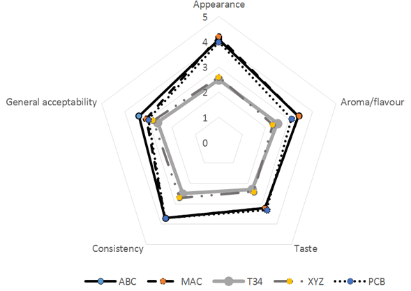 Figure-1. Sensory attributes of tiger nut non-dairy milk samples with preservatives. ABC= Tiger nut non-dairy milk without preservative (control); MAC= Tiger nut non-dairy milk with ginger extract; T34= Tiger nut non-dairy milk with turmeric extract; XYZ=Tiger nut non-dairy milk with combination of ginger and turmeric extracts; PCB = Tiger nut non-dairy milk with citric acid.