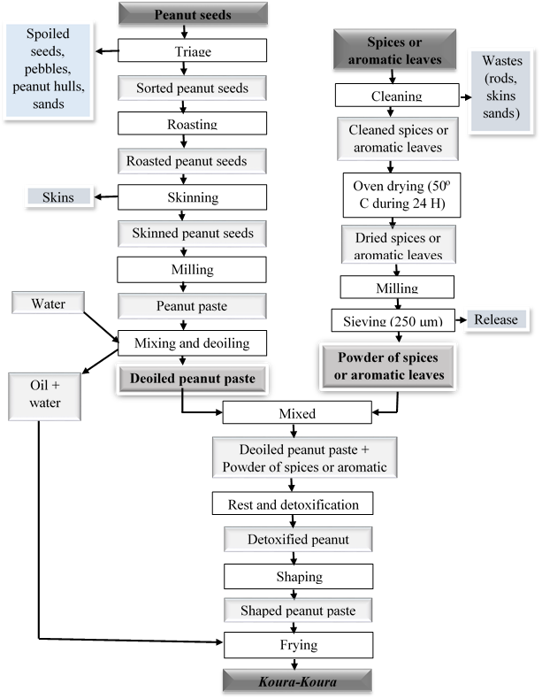Peanut is the main plant material that has been used for the production of koura-koura. The spices and aromatic leaves that were used in the production of koura-koura were: garlic, ginger, pepper, and mint. Peanut, spices and aromatic leaves were purchased in local markets in the city of Ouagadougou.