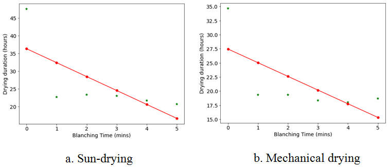 Figure-1. The negative correlation between blanching time (minutes) and drying duration (hours) for a. Sun-drying and b. Mechanical drying.