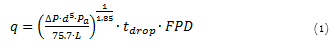 Where ΔP represents the pressure drop (kg cm-2), d is the pipe/air outlet valve diameter (mm), Pa is the pressurizing level (kg cm-2), L is the length of the pipe/outlet valve (mm), tdrop is the pressure drop duration (approximately 1/60 min), FPD is the frequency of pressure drops (drops min-1), and 75.7 is the conversion factor to obtain the air flow in m3 min-1.