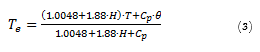 Where H is the air humidity ratio (kg of water kg-1 of dry air), and the subscript o and f represent the initial and final values for each iteration, respectively, Te is the equilibrium temperature (Equation 3, °C), LHV is the latent heat of vaporization (Equation 6, kJ kg-1), and Cp is the specific heat of the product (kJ kg-1 °C-1).
