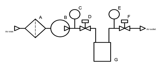 Figure-2. SPD set up diagram. A) air filter, B) compressor and compressed air tank, C and E) pressure gauges, D and F) solenoid valves compressor, G) treatment chamber.