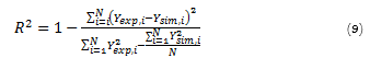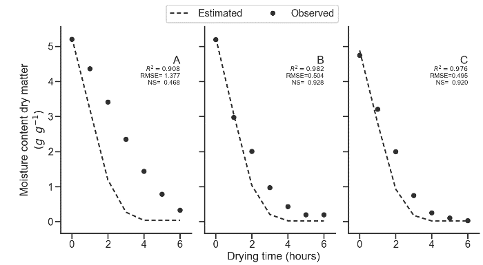 Where Y is the moisture content for each iteration (dry matter), the subscripts exp and sim refer to the experimental and simulated values, respectively, Ῡ is the mean of observed moisture content, and N the number of observations. The best fit is achieved when the RMSE is close to zero, and both, NS and R2 are close to one. In this study, RMSE and NS statistics were used to measure the model performance for forecasting product moisture content whereas R2 was used to analyze the linear regression goodness of fit between observed and estimated data. Also, for model goodness of fit, the intercept and gradient should be close to zero and one, respectively.